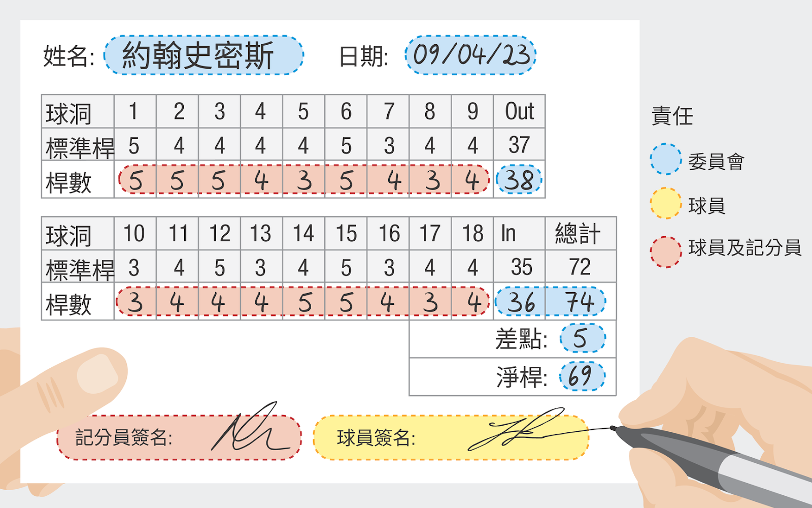必須確定其記分員簽證了其記分卡上各洞之桿數,